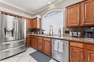 Fully equipped kitchen with modern appliances and Keurig coffee station.