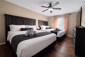 Designed for group comfort, this bedroom offers two plush Queen beds and a Twin bed — perfect for families, sports teams, or weekend getaways.