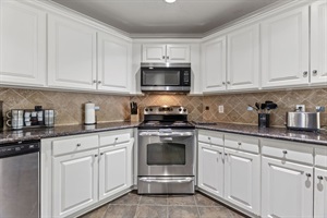 Modern appliances including stove, oven, refrigerator, microwave, and coffee maker